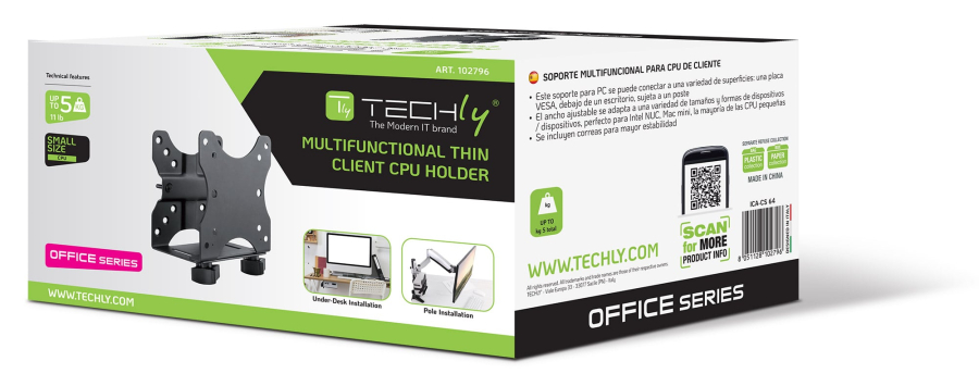 Con ICA-CS 64 posizionare la CPU in un luogo comodo e accessibile non è mai stato così facile. Invece di lasciare la CPU sul pavimento. grazie al design universale di ICA-CS 64 è possibile installarla su diverse superfici: la piastra VESA. direttamente su una scrivania. fissata a un palo. Le cinghie sono incluse per una maggiore stabilità. La sua capacità di peso è di 5 kg.Specifiche