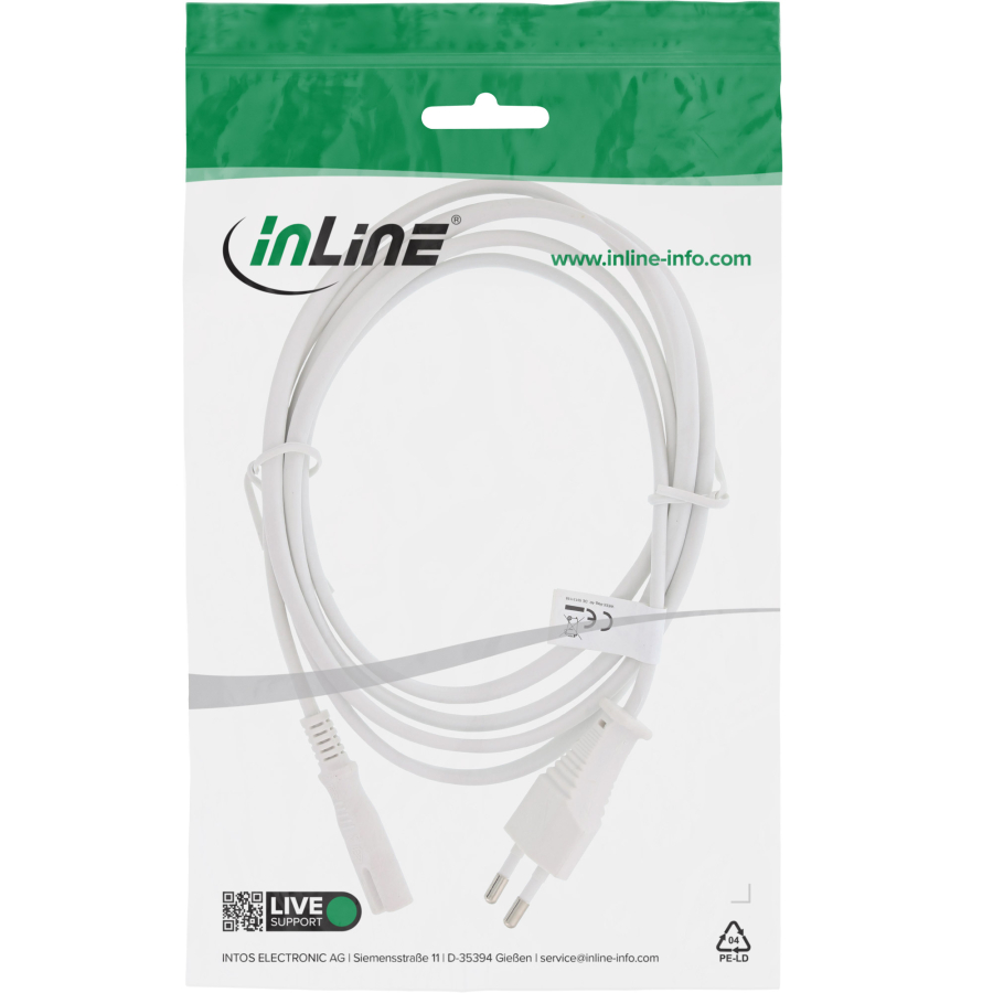 Il cavo di alimentazione InLine con spina Euro a spina Euro 8 (IEC-C7) è la soluzione pratica per l'alimentazione di una vasta gamma di apparecchi elettrici. È ideale per televisori, apparecchiature audio, caricabatterie e molto altro ancora. Il cavo è progettato per uso interno ed è disponibile in diverse lunghezze per offrire la massima flessibilità.