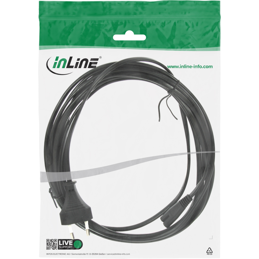 Il cavo di alimentazione InLine con spina Euro a spina Euro 8 (IEC-C7) è la soluzione pratica per l'alimentazione di una vasta gamma di apparecchi elettrici. È ideale per televisori, apparecchiature audio, caricabatterie e molto altro ancora. Il cavo è progettato per uso interno ed è disponibile in diverse lunghezze per offrire la massima flessibilità.