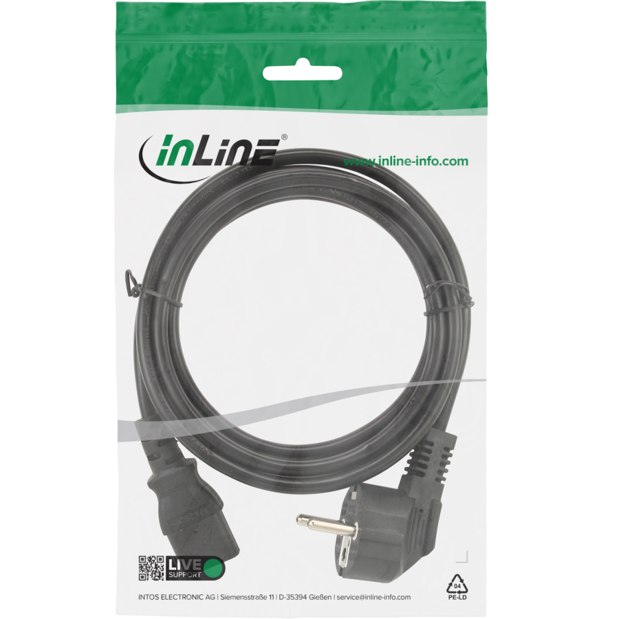 Il cavo di alimentazione InLine con spina angolare con contatto di protezione (CEE7/7) e spina C13 diritta per apparecchi a freddo è la soluzione pratica per dispositivi con connessione per apparecchi a freddo, ideale quando lo spazio per le spine convenzionali è limitato. Che sia dietro la scrivania, montato a parete o nell'ufficio domestico, la spina angolare con contatto di protezione consente di risparmiare spazio e previene la rottura dei cavi.