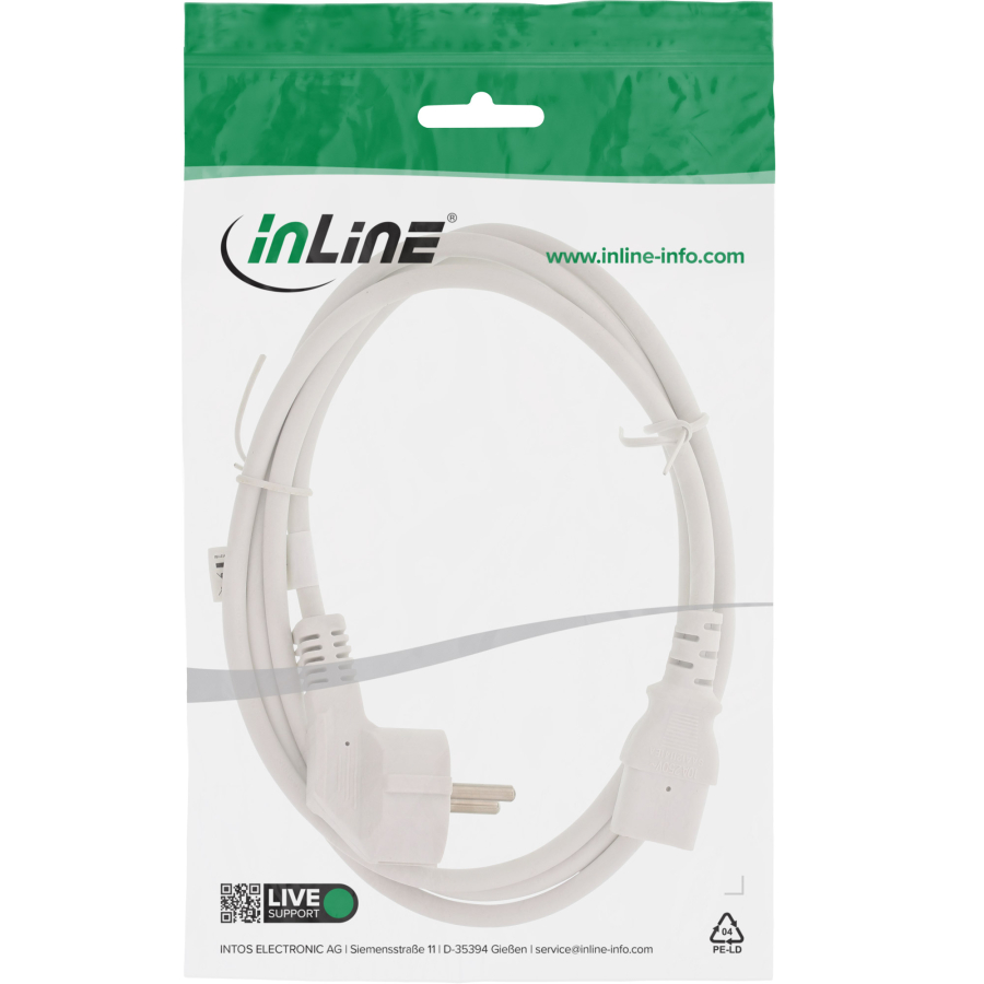 Il cavo di alimentazione InLine con spina angolare con contatto di protezione (CEE7/7) e spina C13 diritta per apparecchi a freddo è la soluzione pratica per dispositivi con connessione per apparecchi a freddo, ideale quando lo spazio per le spine convenzionali è limitato. Che sia dietro la scrivania, montato a parete o nell'ufficio domestico, la spina angolare con contatto di protezione consente di risparmiare spazio e previene la rottura dei cavi.