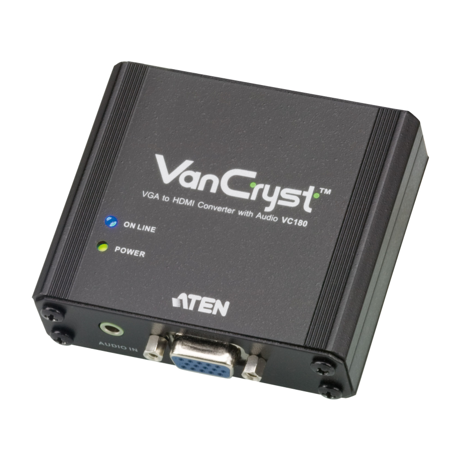Il VC180 è un convertitore da VGA a HDMI che consente di visualizzare i dati provenienti dalla sorgente VGA su uno schermo HDMI con audio di qualità stereo. Utilizza due fonti di alimentazione: la porta VGA o un alimentatore. Il VC180 si alimenta tramite la porta VGA. Ad ogni modo, se il dispositivo sorgente non è in grado di fornire alimentazione, utilizzare l'alimentatore. Il VC180 è un dispositivo compatto, flessibile e facile da installare che non richiede alcun software. È sufficiente realizzare i collegamenti hardware ed è subito pronto.