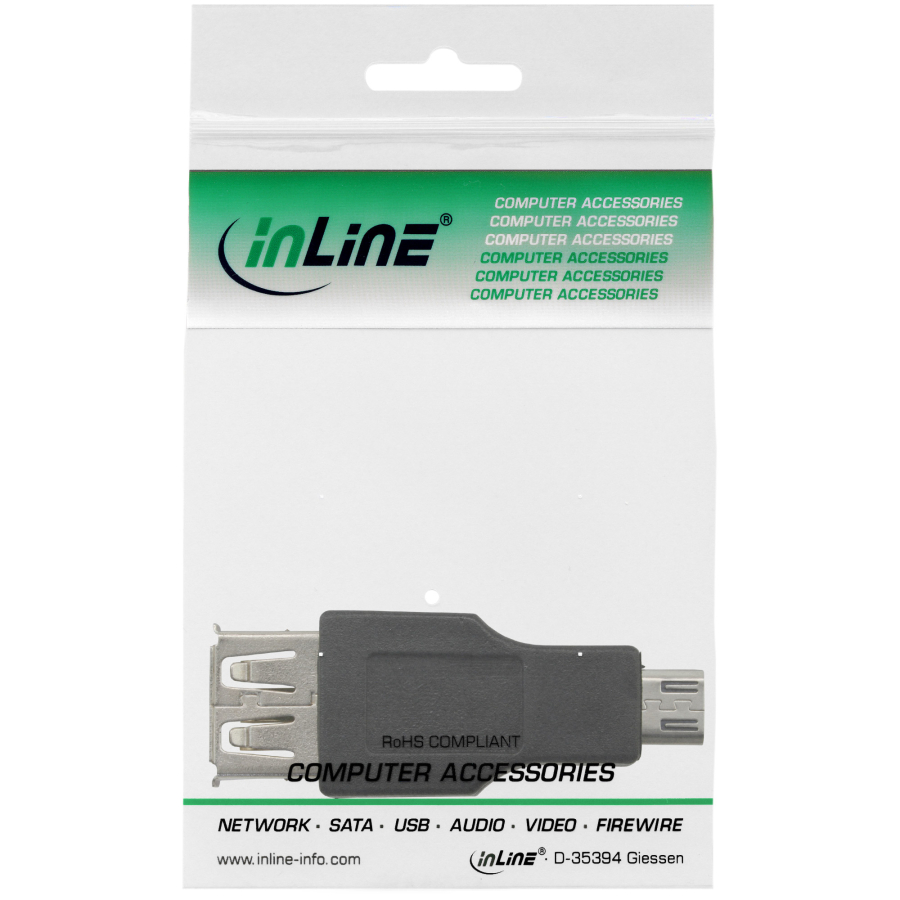 Adattatore Micro-USB, InLine, da spina Micro-B a presa USB A. Questo adattatore serve per adattare un cavo USB con connessione A a una presa Micro-B (angoli smussati). Questo adattatore è disponibile anche con spina Micro-A (design rettangolare); al momento dell'acquisto, verificare la connessione/presa del dispositivo. Questo adattatore non supporta la funzione USB OTG per i dispositivi mobili.