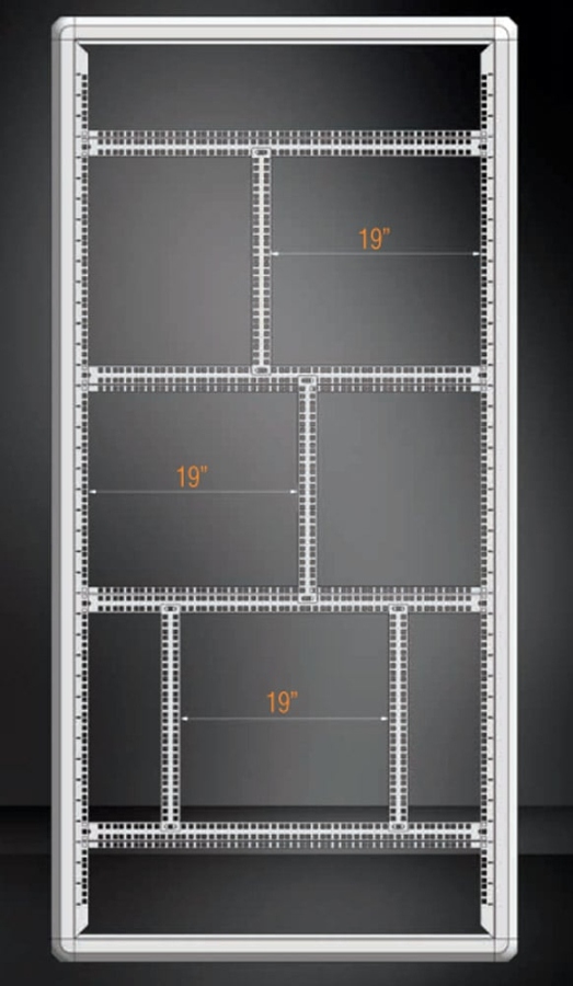 - I profili verticali possono essere installati in modo da stabilire una distanza di 19” tra loro. nonché affiancati mantenendo sempre una distanza di 19”