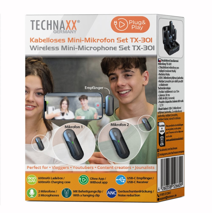 Set 2 Mini Microfoni Lavalier Wireless con Ricevitore USB-C™ e Custodia di Ricarica. TX301