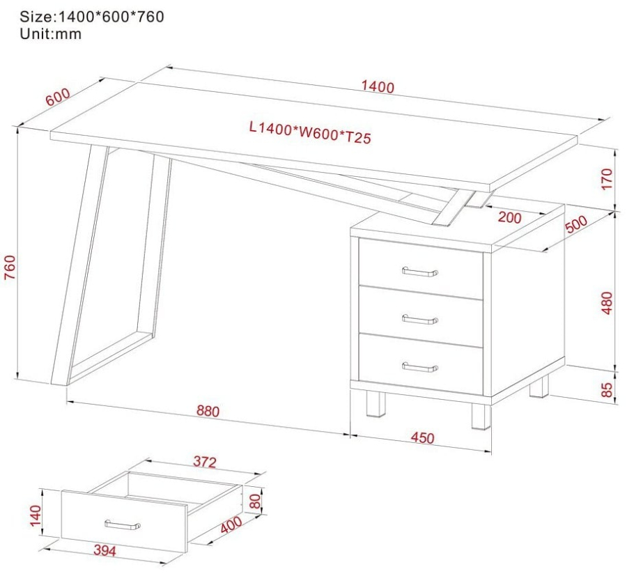 - Ampia area di lavoro 1400 x 600 mm e cassettiera a 3 cassetti