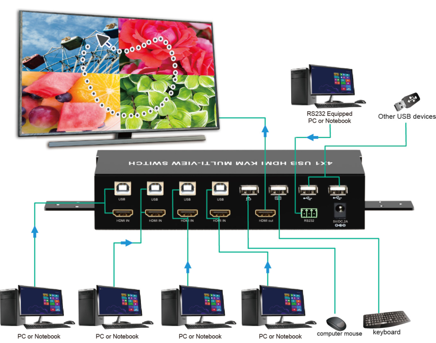 - HDMI KVM 4x1 multiviewer con switcher