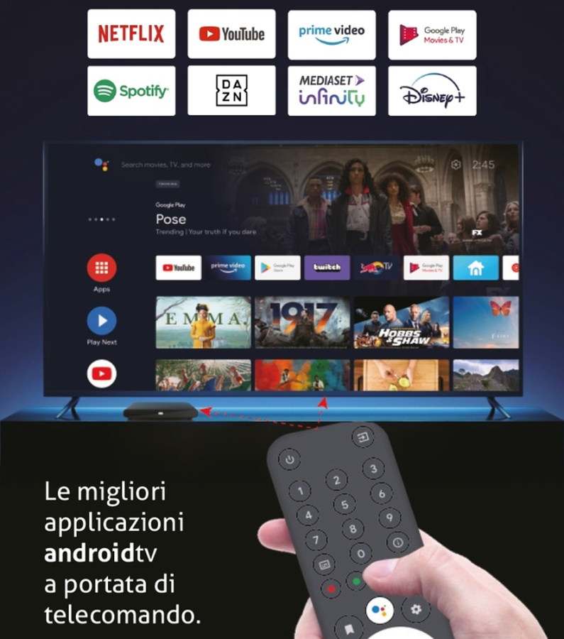 Decoder Homatics Android tv ufficiale.Certificato Google con Sintonizzatore DVB-T2 per trasformare il tuo vecchio televisore in un moderno AndroidTV compatibile con lo standard DVB-T2 della nuova TV digitale. Le migliori applicazioni Video On Demand. certificate dagli operatori. in una interfaccia moderna e flessibile. tutto a portata di telecomando e facilmente accessibile. Telecomando Bluetooth intelligente. con tasti dedicati alle applicazioni certificate NETFLIX. PRIME VIDEO. YOUTUBE e LIVE TV. e Assistente Vocale Google integrato Sintonizzatore DVBT2 HEVC Main10 USB incluso nella confezione. per la ricezione di tutti i programmi della nuova TV digitale e compatibile anche con i futuri programmi in 4K. Play Store Google ufficiale che garantisce l installazione di APP Video in versione ottimizzata per i grandi schermi TV senza limitazione di banda. con incluse le versioni 4K di FILM e SERIE TV. Bluetooth 4.2 per il collegamento contemporaneo di più accessori: tastiera. mouse. cuffie o auricolari. e perfino un controller per videogame. Funzione CEC su HDMI che consente il controllo completo del BOX anche con il telecomando del televisore. Ingressi USB 2.0 (1x) e 3.0 (1x) Memoria Flash 8GB espandibile grazie allo slot per microSD. Tutta la TV possibile via antenna e via Internet alla massima qualità!Dongle DVB-T2 Plug & PlayCollega al BoxQ android tv Google il ricevitore digitale terrestre DONGLE DVB-T2 HEVC MAIN10 e sarai già pronto per la visione della Nuova TV Digitale.Il Dongle DVB-T2 non necessita di alimentazione o telecomando dedicati e si installa collegandolo semplicemente all’ingresso USB-C presente sul retro del decoder android tv BoxQ.UsciteIl BoxQ Google Homatics AndroidTV dispone di numerosi ingressi ed uscite per godere appieno dei tuoi dispositivi personalizzati: