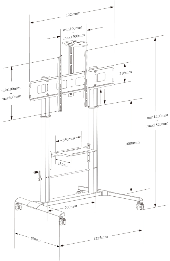 - Dimensioni: 1225 x 870 x 1550/1820 mm; Colore stand TV con ruote e due mensole: nero