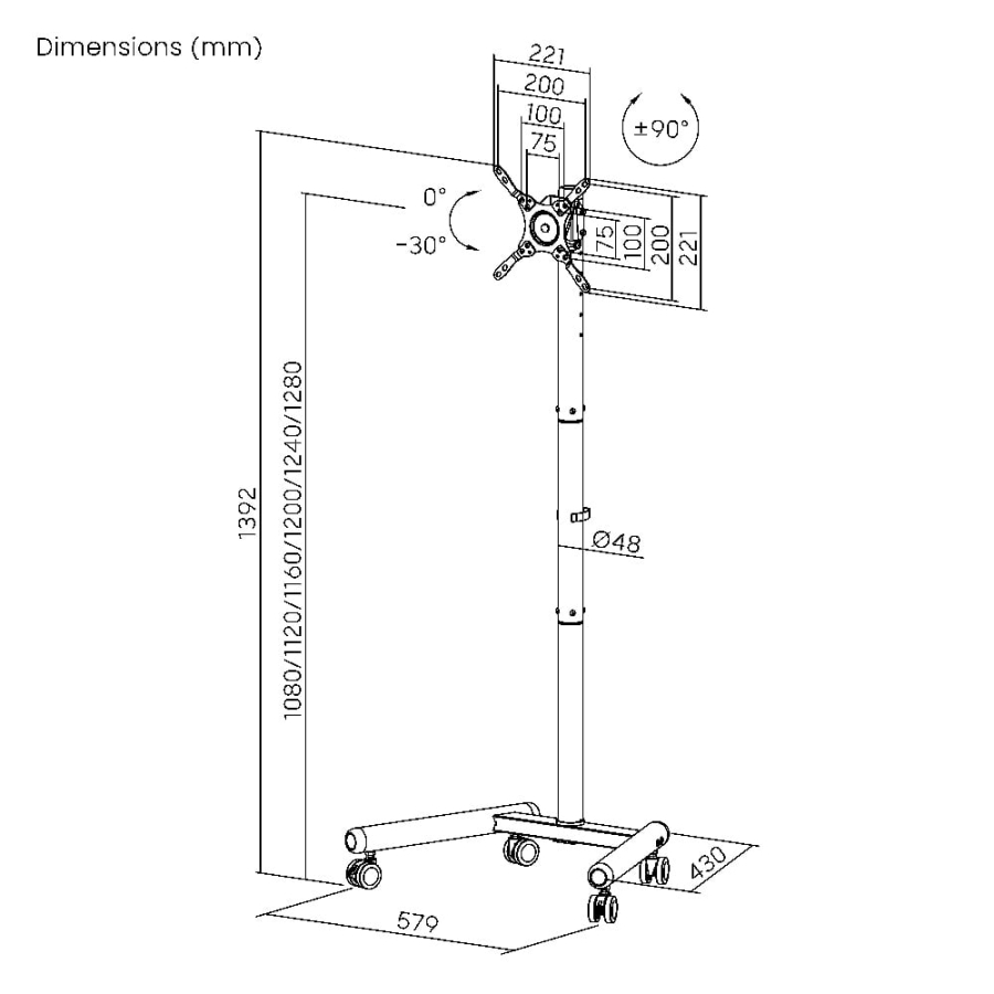 - La regolazione dello schermo è ulteriormente migliorata dal design inclinabile da 0 a -30° e girevole +/- 90°. mentre la flessibilità di movimento è garantita da 4 ruote con meccanismo di bloccaggio